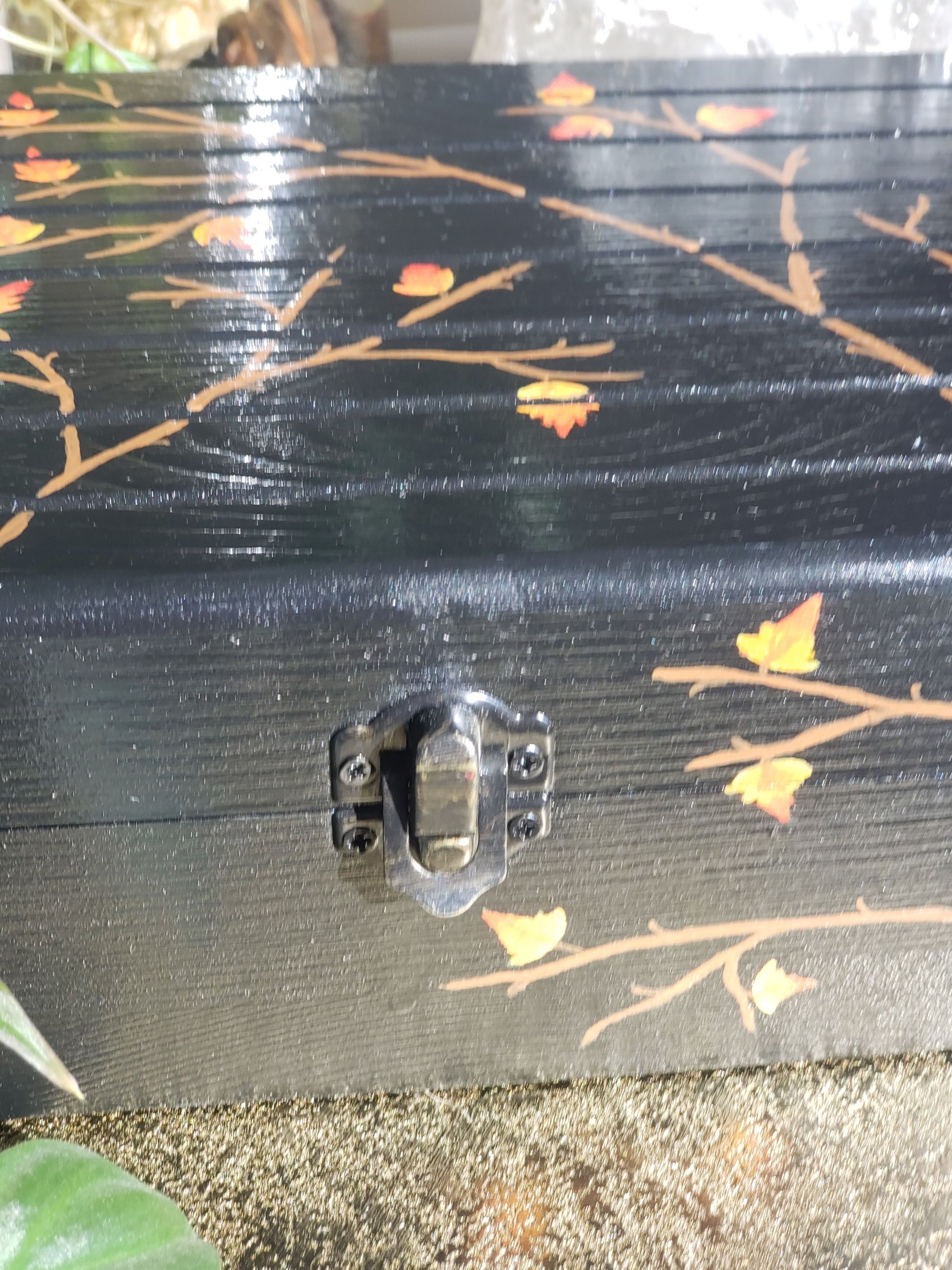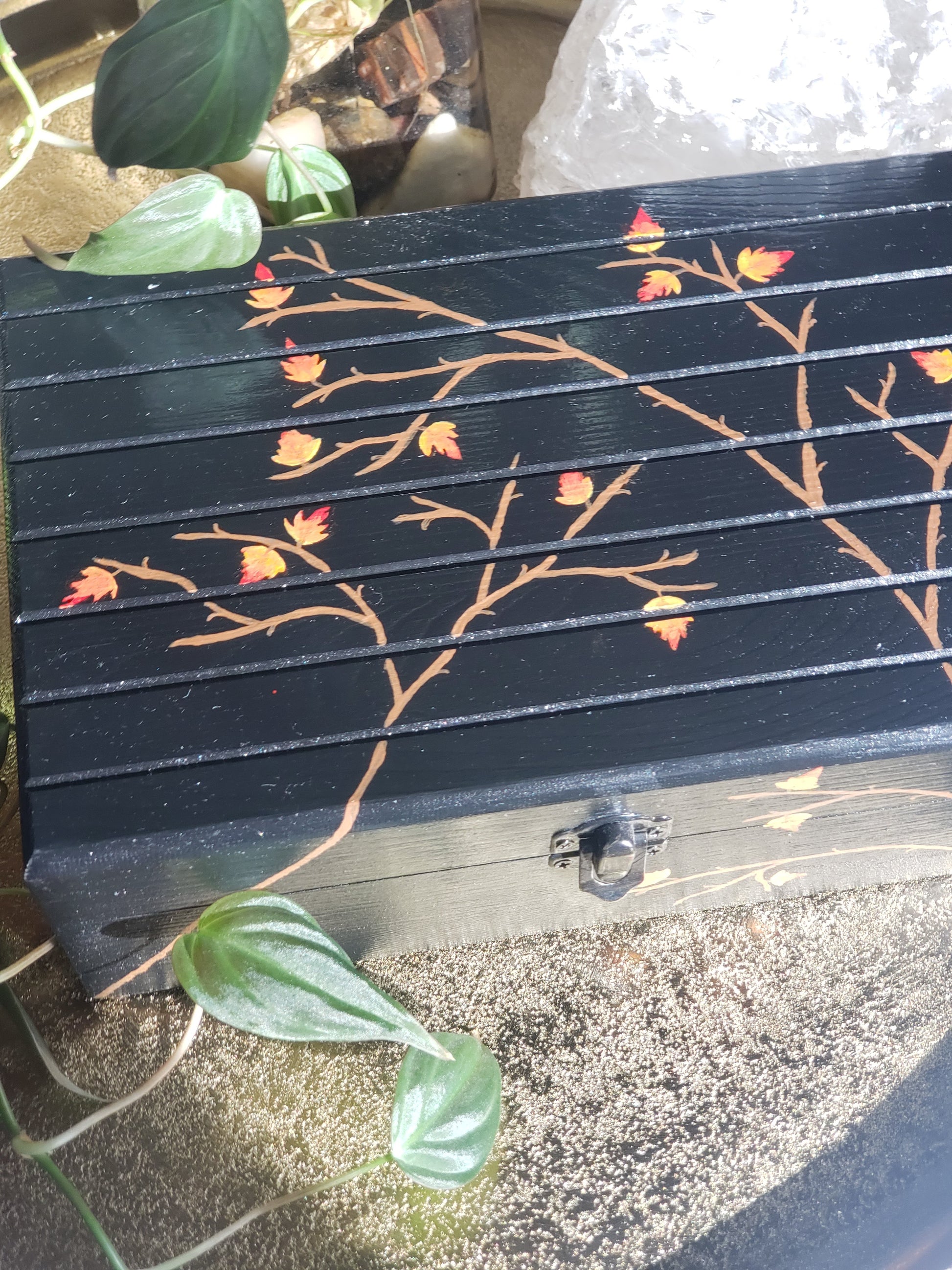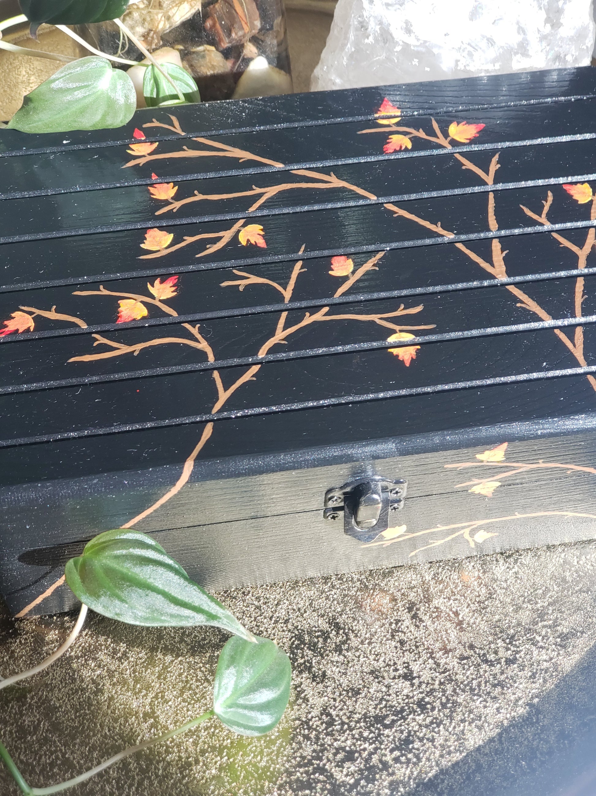 There are several symbolistic traits for leaves per the tree they come from and the color. This box was not made with a certain symbolism, but reather just love the color scheme together. Black base with orange, red, and yellow fall colored leaves.