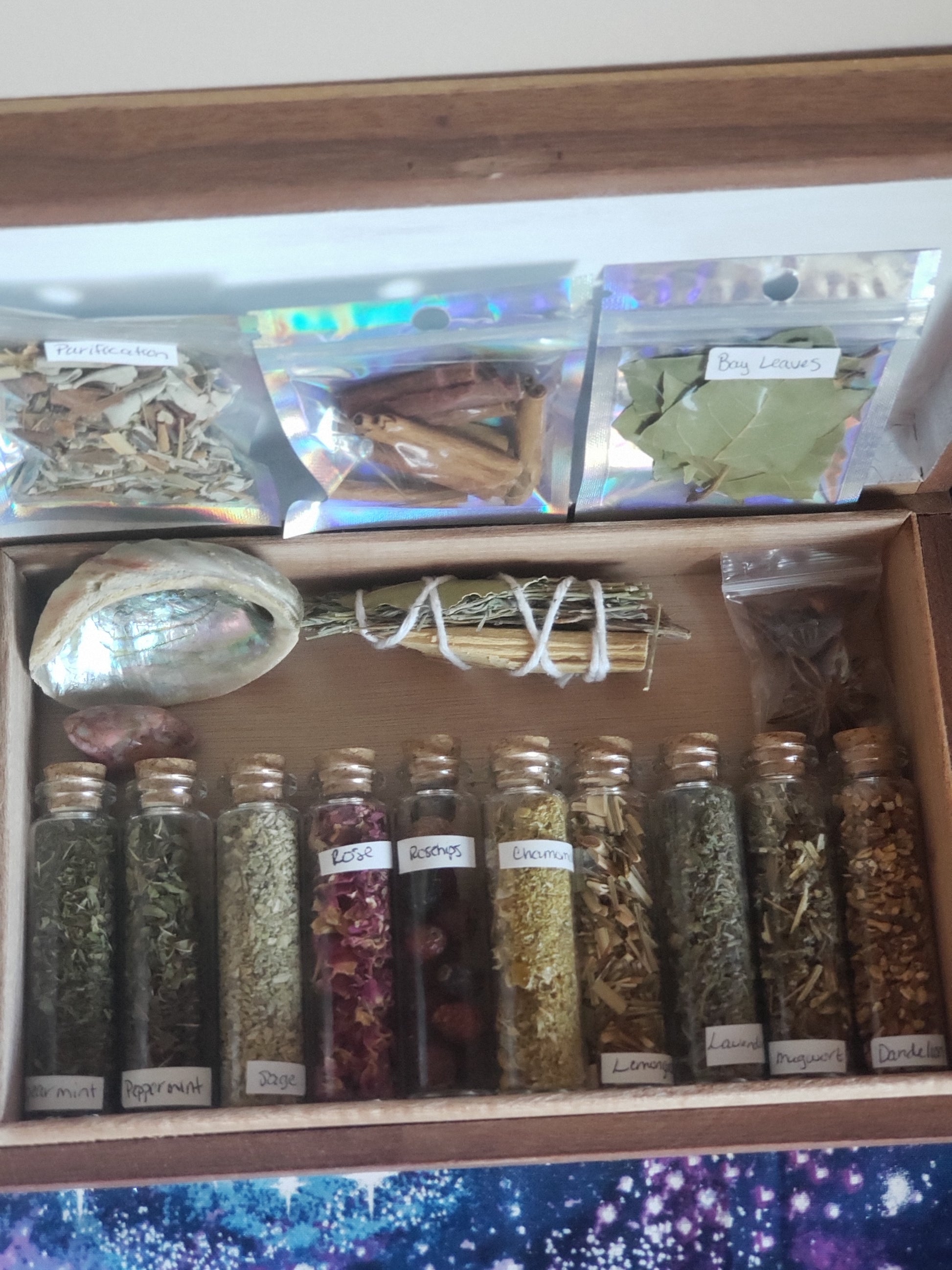 All of our witch boxes are prefilled with a variety of basic herbs and small altar tools to assist in your spiritual journey. If custom herbs are needed, please send us a message after purchase.