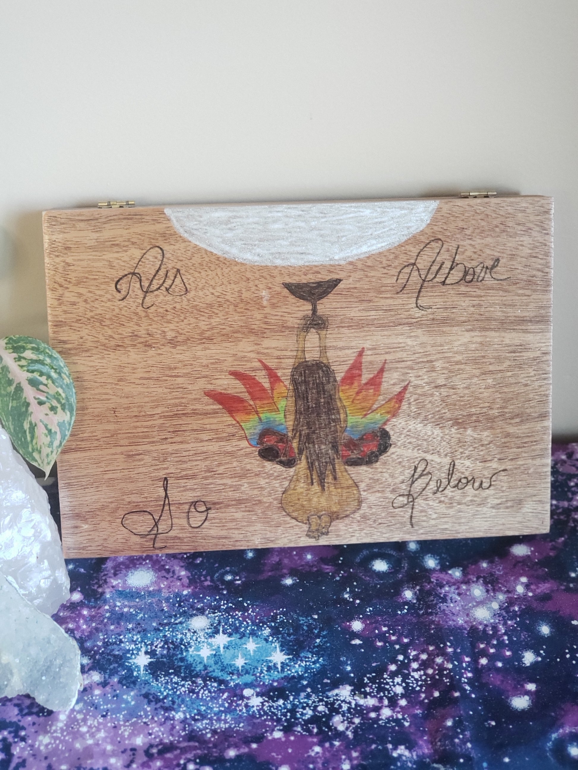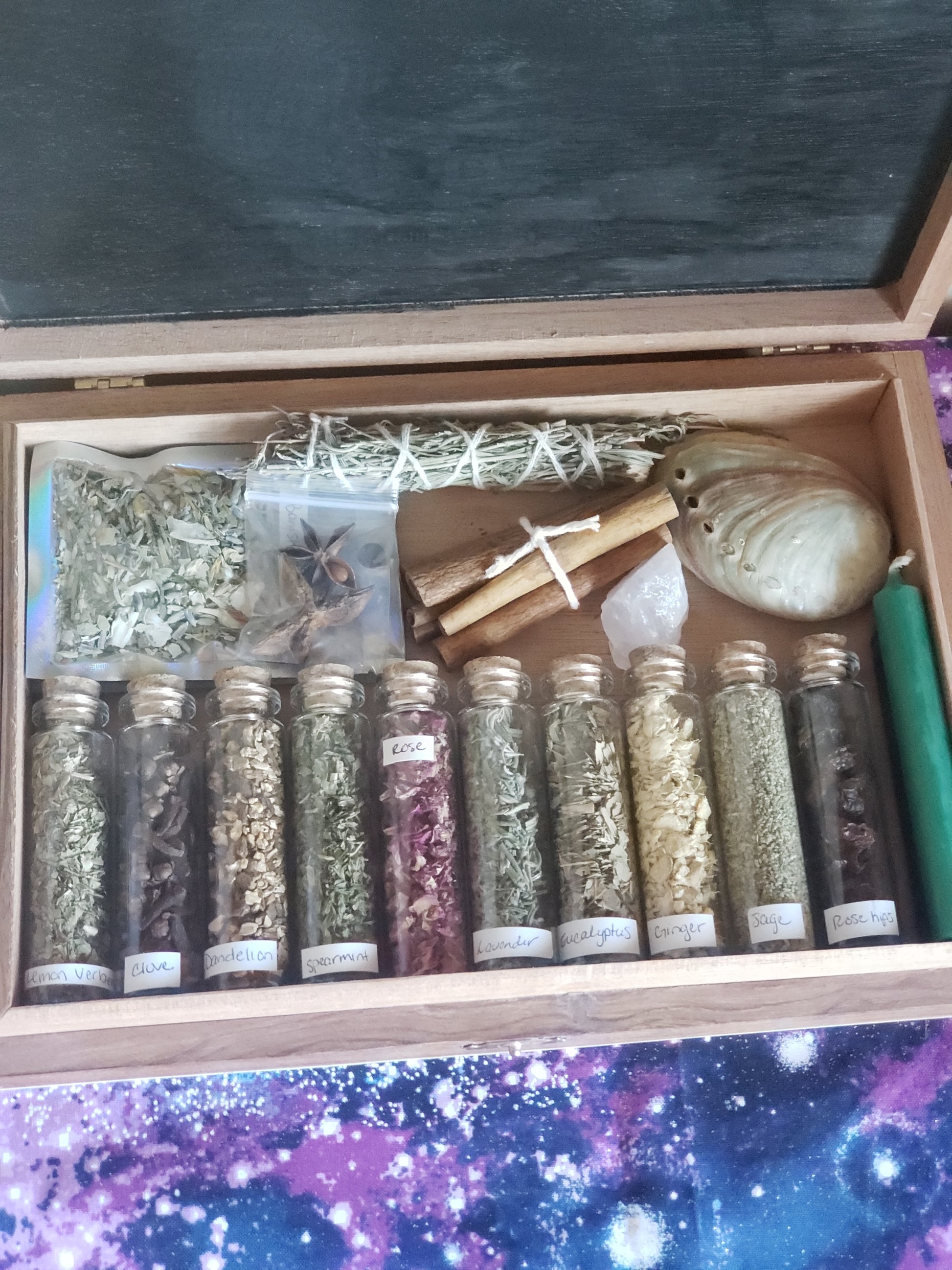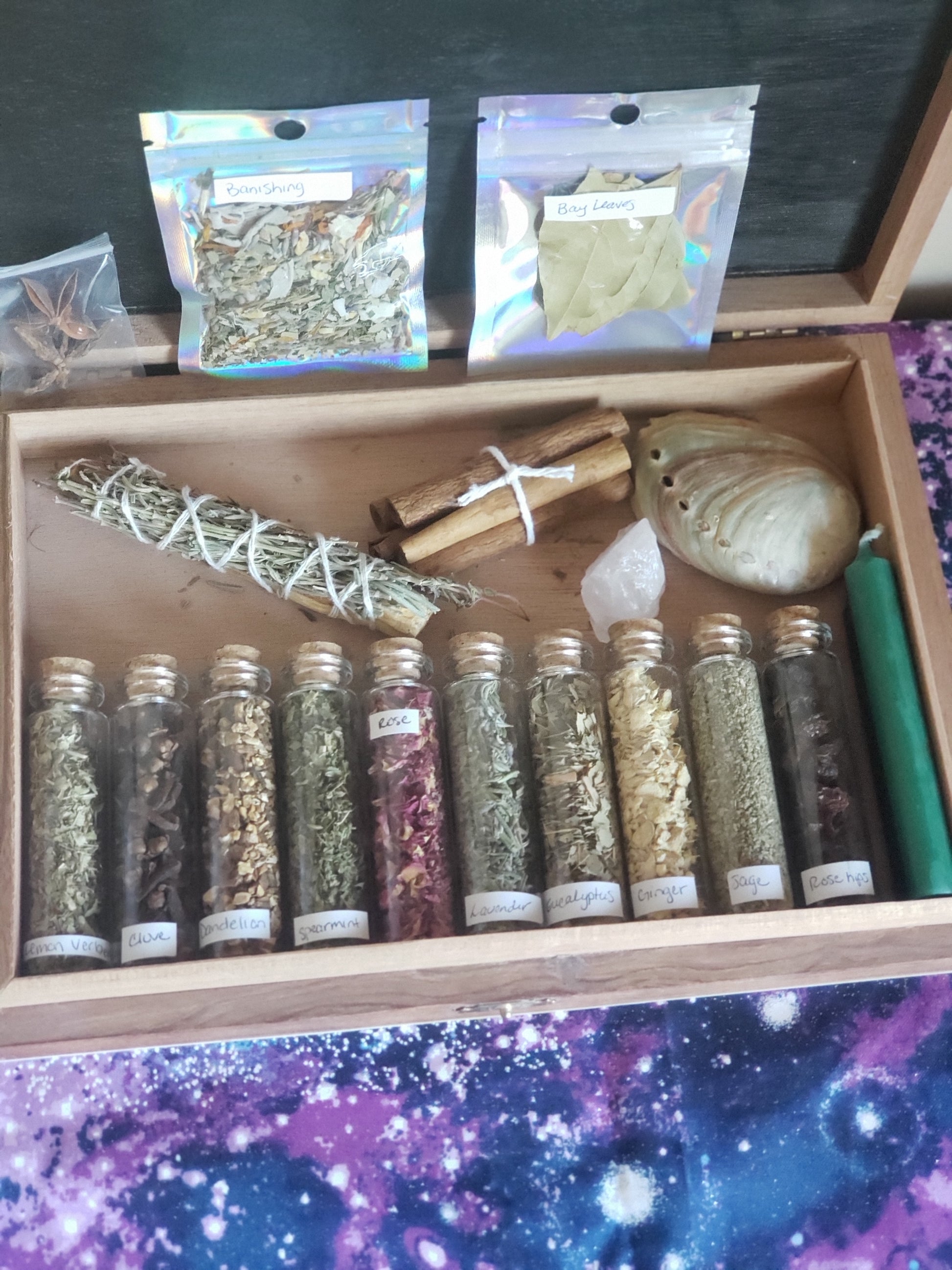 Our witch boxes are prefilled with various basic herbs and small altar tools to assist in your journey. Custom herbs available upon request by email.
